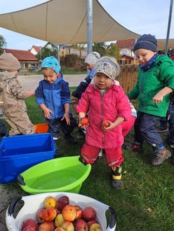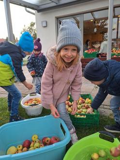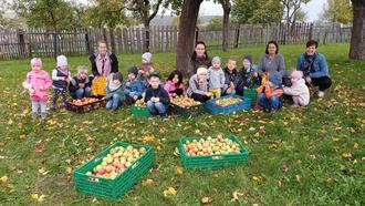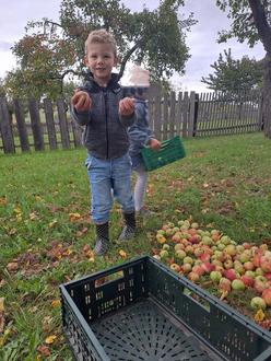 Borsch. Auch in diesem Jahr haben wir gemeinsam mit den Kindern Äpfel zum Apfelsaftpressen gesammelt. Mit großen Kisten haben sich alle auf den Weg zu Familie Kramer gemacht, die uns auch in diesem Jahr die Äpfel zur Verfügung gestellt haben. Vielen lieben Dank an Familie Kramer. Mit unseren fleißigen Kindern haben wir acht Stiegen Äpfel aufgelesen und mit in den Kindergarten genommen. Beim Auflesen hatten die Kinder einen riesigen Spaß und der ein oder andere Apfel wurde vor Ort vernascht.