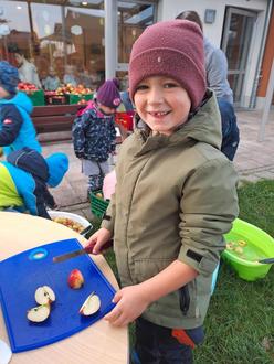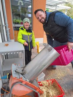 Am Mittwoch, 18.10.2023 wurden die gesammelten Äpfel mit vereinten Kräften gewaschen, geschnitten und anschließend in den Zerkleinerer geworfen. Die Kinder hatten großen Spaß beim Waschen, Schneiden und häckseln der Äpfel. Anschließend kamen die klein gehäckselten Äpfel in die Apfelpresse und der erste Apfelsaft ist aus der Presse geflossen. Mit ihren Bechern haben die Kinder den Apfelsaft direkt aus der Presse probiert und schauten gespannt zu, wie aus den Äpfeln der Saft wird.