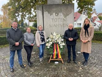 Matthias Kehr, Simone Kleinstück, Astrid Weimann-Heim, Wilhelm Heumüller und Bürgermeisterin Manuela Henkel zur Kranzniederlegung am Brandplatz in Geisa