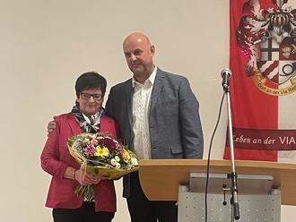 Marco Übelacker (r.) überreichte einen Blumenstrauß an Silvia Weber (l.) vom Geisaer Bauamt, die den gesamten Bauablauf mit Fachkompetenz und Ausdauer begleitete