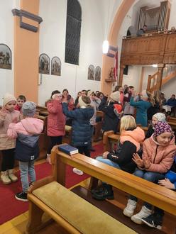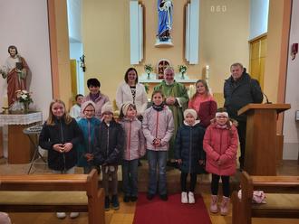 Im Anschluss an die Messe wurde Pfarrer Lerg von der Kirchengemeinde mit einem Ständchen überrascht. Rudi Nensel übermittelte im Namen des Verwaltungsrates, des Pfarrgemeinderates sowie der Kirchengemeinde Otzbach/Geblar die besten Glücks- und Segenswünsche zum 60. Geburtstag. Anschließend führte ein Teil der Otzbach/Geblarer Tanzkinder eine Polka auf. Wie es "Tradition ist" sollte Pfarrer Lerg nun die 60 Geburtstagskerzen auspusten, dabei unterstützen ihn die Kinder sehr gerne.