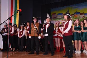 Nach einer kurzen Begrüßung marschierte der gesamte Verein auf die Bühne, um gemeinsam mit dem närrischen Publikum „Allewill gehts los“ zu trällern. Die Vereinsvorsitzenden Steffi vom Geisblick (Stefanie Knauf) und Bastian von der Grünen Au (Bastian Egle) hatten nach ihrer Eröffnungsrede die ehrenvolle Aufgabe, zwei langjährige Karnevalisten des Vereins zu würdigen und ihnen zu ihrem Jubiläum herzlich zu gratulieren. Peter von der Kiliansburg (Peter Möller) ist seit 50 Jahren Mitglied des GHCC, Achim von der Schere (Achim Rohm) bereits seit 60 Jahren. Peter von der Kiliansburg erhielt den Ehrenorden des Vereins in Bronze und wurde zum Ehrenmitglied ernannt. Achim von der Schere, der bereits Ehrenmitglied und Träger des Ordens in Bronze ist, bekam eine Ehrentafel überreicht.