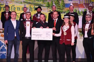 Im Anschluss daran folgte eine Spendenübergabe an den GHCC. Knapp 30 Jahre Karnevalsgeschichte stecken in den Kostümen der Grünen Garde, weshalb eine Anschaffung neuer Kostüme dringend nötig war. Hierzu kamen der Initiator der Spende, Ehrenmitglied des Vereins Martin Henkel (MdL), gemeinsam mit den Mitarbeitern der Sparkasse Daniel Malsch (Leiter Privatkundenbereich) und Andreas Schütz (Kundenberater der Filiale Geisa) auf die Bühne. Sie überreichten – auch im Namen des Vorstandsmitgliedes der Sparkasse, Joachim Press – dem GHCC einen Spendenscheck in Höhe von 2.000 EUR. Die Gardekostüme werden aktuelle gefertigt und haben ihr Debüt zu einer der nächsten Veranstaltungen.