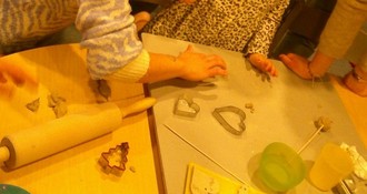 Weihnachtsfeier - Eltern und Kinder beim Weihnachtsbaumanhänger herstellen