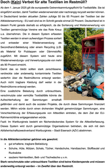 Ab dem 1. Januar 2025 gilt die europaweite Getrenntsammlungspflicht für Textilabfälle. Sie ist eingeführt worden, damit Textilien wiederverwendet oder nachrangig recycelt werden können. In Deutschland landen aktuellen Zahlen zufolge 50 bis 65 Prozent der Textilien bei der Altkleidersammlung - EU-weit sind es im Schnitt gerade einmal 22 Prozent. Deutschland ist in diesem Punkt gerade deshalb so erfolgreich, da die Sortierung und Weiterverwertung von Textilien gemeinnützige Vereine wie das Rote Kreuz u.a. übernehmen. Die in diesem System erfassten Textilien werden in einem aufwendigen Prozess sortiert und entweder einer Wiederverwendung als Secondhand-Bekleidung oder einem Recycling (z.B. als Material für Putzlappen oder Dämmstoffe) zugeführt. Mit diesem System wird heute eine Wiederverwendungs- und Verwertungsquote von mehr als 90 Prozent erreicht.
