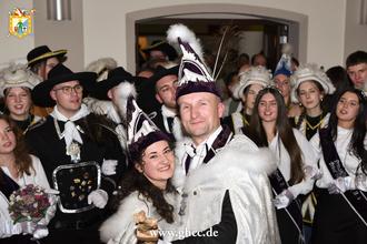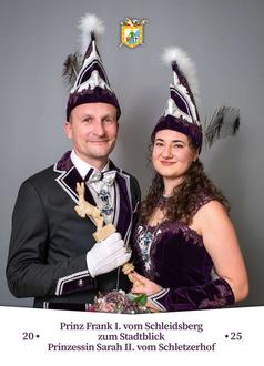 Der Höhepunkt des Abends ließ nicht länger auf sich warten. Der Verein versammelte sich auf der Bühne, und als der Vorhang fiel, wurde unter großem Applaus das neue Prinzenpaar präsentiert: Prinz Frank I. vom Schleidsberg zum Stadtblick und Prinzessin Sarah II. vom Schletzerhof. In seiner Proklamation forderte Prinz Frank alle Närrinnen und Narren auf, in den kommenden Wochen gemeinsam zu feiern, die Gassen und Straßen zu schmücken, Kostüme zu bauen und eine tolle Saison zu erleben. Das Prinzenpaar der vergangenen Saison übergab feierlich die närrischen Insignien und konnte dem frisch gekürten Prinzenpaar seine Gratulation überbringen. Das Prinzenpaar eröffnete inmitten der Menge den Tanz und wurde vom begeisterten Publikum beglückwünscht.