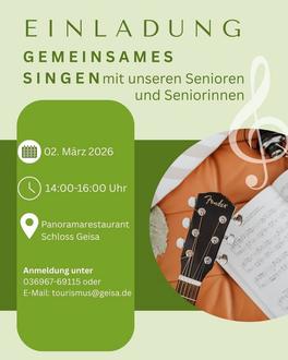 Geisa. Gemeinsam mit Elvira Fischer lädt die Stadt Geisa am Montag, den 2. März 2026 alle Seniorinnen und Senioren zu einem geselligen Nachmittag mit Musik und gemeinsamen Singen ein. Die Veranstaltung findet von 14 bis 16 Uhr im Panorama-Restaurant des Schlosses Geisa statt. In gemütlicher Atmosphäre erwartet die Seniorinnen und Senioren ein fröhlicher und belebender Nachmittag voller gemeinsamer Lieder und musikalischer Begegnungen. Bekannte Melodien und vertraute Lieder sollen Erinnerungen wecken, die Gemeinschaft stärken und für gute Stimmung sorgen. Damit der Nachmittag gut geplant werden kann und man sich auf viele musikbegeisterte Gäste freuen darf, wird um eine Voranmeldung im Tourismusbüro Geisa gebeten. Das Tourismusbüro ist dienstags, donnerstags und freitags von 11 bis 15 Uhr erreichbar. Die Anmeldung ist telefonisch unter 036967-69115 oder per E-Mail an tourismus@geisa.de möglich.