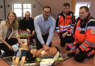 Geisa. Schnelle und fachgerechte Wiederbelebungsmaßnahmen können Leben retten. Um hier zu unterstützen, spendete die Firma Datafox GmbH aus Geisa 1.500 € an die Freiwillige Feuerwehr Geisa für die Anschaffung eines Defibrillators. Mit dem Gerät können professionell im Notfall Wiederbelebungsmaßnahmen durchgeführt werden. „Es war uns ein großes Anliegen mit diesem Gerät in der Region mehr Hilfeleistung bieten zu können“, betonte Sean Paul Perez, Pressesprecher von Datafox. Er vertrat bei der Scheckübergabe die Datafox-Geschäftsführer Matthias Hartung und Markus Heil. Perez wurde genauso wie Bürgermeisterin Manuela Henkel dann auch gleich von den DRK-Mitarbeitern Mario Kuhnert und Stephan Seipt in das Gerät eingewiesen. Dazu mussten sie nach Sprachanweisung des Defibrillators die Elektroden am Körper des Dummies befestigen und mit Kraft den Brustkorb drücken. „Bei kleineren Kindern bis 25 Kilo Körpergewicht nimmt man die beiden Daumen“, erklärte Stephan Seipt. Bei Säuglingen soll der Defibrillator nicht eingesetzt werden. Das Schlimmste ist, im Notfall gar nichts zu machen“, betonte Kuhnert. „Im Notfall kommt es immer auf die ersten Sekunden an.“ So sterben bei einem Sauerstoffmangel pro Minute etwa zehn Prozent der Gehirnzellen ab. Kuhnert empfiehlt, immer mal wieder einen Auffrischungskurs zur Ersten Hilfe zu besuchen und sich dann auch in die Funktionsweise des Gerätes einweisen zu lassen. Der Defibrillator erstellt und sendet im Übrigen auch einen Einsatzbericht. Das Gerät soll in der Feuerwehr Geisa auf einem Einsatzfahrzeug mitgeführt werden, damit es im Notfall immer sofort einsatzbereit ist. „Der Defibrillator ist eine außerordentlich sinnvolle Anschaffung, die der ganzen Bevölkerung nutzt“, sagte Bürgermeisterin Manuela Henkel und dankte der Firma Datafox für die finanzielle Unterstützung.
