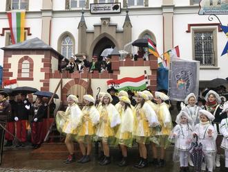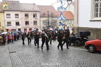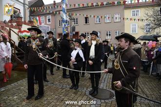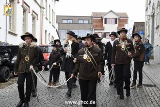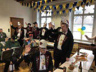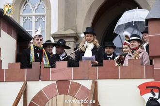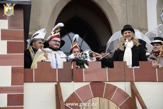 Geisa. Zur Einleitung der drei tollen Tage musste natürlich auch in diesem Jahr das Rathaus wieder gestürmt werden. Nachdem die Bürgerwehr zwei Kanonenschüsse abgegeben hatte und die weiße Fahne aus dem Rathausfenster gehisst wurde, wurden die Bürgermeisterin Manuela Henkel mit der Ersten Beigeordneten Simone Kleinstück und den Ratsherren gefangen genommen. Nachdem man den „Becher der Vereinigung“ mit dem Prinzenpaar getrunken und die Schlüssel übergeben hatte mussten sich die Ratsherren frei kaufen. Im Anschluss wurde im Rathaussaal ausgelassen gefeiert. Das Prinzenpaar nahm selbstverständlich auf dem Bürgermeisterstuhl Platz, wo es sich auch in das Buch der Prinzenpaare einschrieb. Ebenso erhielt das Prinzenpaar von der Bürgermeisterin eine Schieferntafel mit Schlüssel als Andenken für die Rathauserstürmung überreicht. Die Ratsherren Simone Kleinstück, Martin Möller, Hartmut Bader und Mario Trabert sowie Hauptamtsleiter Steffen Bott und Bauhofleiter Rainer Wald wurden vom GHCC-Vorstand mit Orden und Ansteckern ausgezeichnet. Musikalisch wurde der Nachmittag von der Stadtkapelle Geisa gestaltet.