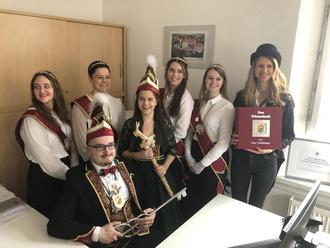 Das Prinzenpaar nebst Hofstaat im Bürgermeisterdienstzimmer, wo es sich im "Prinzenbuch" einschrieb
