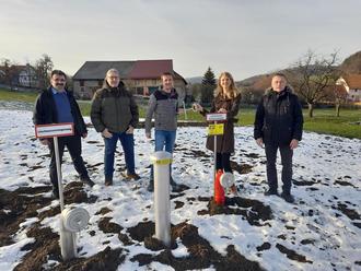 (v.l.n.r.) Bauhofleiter Rainer Wald, Ortsteilbürgermeister Danilo Schlapmann, Wehrführer Stefan Trabert, Bürgermeisterin Manuela Henkel und Bauamtsleiter Bodo Kind am neuen Löschwasserbehälter in Reinhards