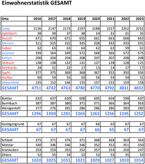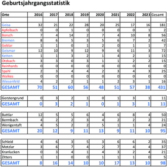 Geisa. Die Entwicklung der Einwohnerzahl in der Stadt Geisa und deren elf Ortsteile ist im Vergleich zwischen den Jahren 2022 und 2023 stabil geblieben. Im 7-Jahresvergleich von 2016 zu 2023 jedoch um 2 Prozent gestiegen. Das ergibt eine Auswertung der Einwohnerzahlen durch die Stadtverwaltung Geisa. Diese wurde von Bürgermeisterin Manuela Henkel bei der letzten Stadtratssitzung präsentiert. Die Einwohnerzahlen sind von 4.751 Einwohnern in 2016 auf 4.832 in 2023 gestiegen. „Das ist natürlich bei dem aktuellen demografischen Trend eine sehr positive Entwicklung für unsere Kommune“, freute sich die Bürgermeisterin. Die Entwicklung in den einzelnen Orten falle bei der Betrachtung der Zahlen unterschiedlich aus. In der Kernstadt stiegen die Zahlen im Sieben-Jahreszeitraum von 2.156 auf 2.252 um insgesamt 4,5 Prozent. „Dies kommt vor allen Dingen durch Zuzug zustande, welcher besonders durch den Verkauf zahlreicher Baugrundstücke im Baugebiet bedingt war“, erläuterte Manuela Henkel. Mit einem wachsenden und gut aufgestellten Gewerbegebiet, Einkaufszentrum, medizinischer Versorgung, Kindergarten und Schulen sowie dem sich entwickelten Freizeitangebot sei Geisa sehr gut aufgestellt. Auch die günstige Lage zu Hessen mit der Nähe zu Hünfeld, Fulda und Bad Hersfeld stärke den Standort Geisa. „Letztlich ist es aber auch die Lebensqualität vor Ort mit einer starken Gemeinschaft, einem guten Zusammenhalt mit funktionierenden Familienstrukturen, Nachbarschaftshilfe und aktiven Vereinen und Kirchengemeinden, die uns ausmachen“, ist sich die Bürgermeisterin sicher. Den größten Zuwachs in den Ortsteilen der Kommune verzeichnet Bremen mit 7,5 Prozent, dessen Einwohnerzahl von 311 auf 331 Einwohner anstieg. Ebenso gab es steigende Einwohnerzahlen in Geismar, Ketten und Wiesenfeld. In den kleinen Orten wie Walkes mit aktuell 51 Einwohnern und Reinhards mit 17 Einwohnern seien die Zahlen allerdings in den letzten Jahren rückläufig, was sich aber in der Gesamtbetrachtung nicht so bemerkbar mache. Die Sterbefallzahlen seien in der Stadt Geisa mit Ortsteilen von 2022 auf 2023 von 64 auf 76 gestiegen. Die Geburtenzahlen in 2023 allerdings von 57 im Vorjahr auf 38 gesunken.