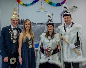 Die Prinzenpaare beider Vereine bedankten sich für die Einladung der Point Alpha Stiftung und betonten die Bedeutung des Treffpunktes, die familiären Überscheidungen sowie das gemeinsame Fastnachtsbrauchtum, welches in beiden Kommunen gleich intensiv zelebriert werde. Als Kind der Wende erinnerte sich Frank Nimmich, wie schön es gewesen sei, durch den Zaun in Richtung Rasdorf zu klettern: „Für mich sind Hessen und Thüringen inzwischen eins.“ Auch seine Partnerin Sarah Mannel-Gogler hob die Verbindungen des Geisaer Amtes ins Hünfelder und Fuldaer Land hervor. „Es ist was einmaliges, Prinzenpaar zu sein“, ergänzten Johannes und Elisa Ebert, und es sei wichtig, die Fastnachtskontakte über die Länder- und Ortsgrenzen hinweg auch in Zukunft zu pflegen. Der KVG-Präsident Matthias Förster stellte fest, dass Fastnacht verbinde und alle nun ungeduldig dem Höhepunkt der Kampagne, dem Rosenmontag entgegenfiebern.