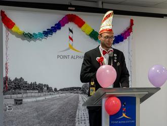 Mit launigen Worten empfangen wurden die Delegationen aus Ost und West vom Geschäftsführenden Vorstand der Point Alpha Stiftung. Eigens für diesen historischen Anlass hatte Benedikt Stock die Geschichtslektüre mit dem Büttenpapier getauscht: „Point Alpha feiert dieses Jahr sein großes Jubiläum. 30 Jahre Gedenkstätte, US-Camp und Grenzmuseum. Für mich war klar, das ist die Gelegenheit, wir müssen das feiern, schon in der Fastnachtszeit.“ In wohl gefeilten Reimen legte er den närrischen Herrschern der Stadt Geisa zudem den Wiedereintritt in die Touristische Arbeitsgemeinschaft Hessischen Kegelspiel nahe, zumal der Mitgliedsbeitrag kurz nach dem Austritt auf null gesunken sei. Feiern könnte man diesen Schritt dann im Pfarrheim von Rasdorf, für das der dortige Bürgermeister laut Zeitungs-Schlagzeilen noch dringend ein Nutzungskonzept suche.