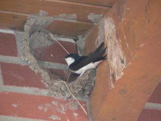 Während die Rauchschwalben in Ställen, Scheunen und in anderen zugänglichen Gebäuden ihre halb offenen Nestschalen bauen, nisten Mehlschwalben von außen an Gebäudefassaden unter Dachvorsprüngen. Die gerade einmal 20 g schweren Tiere leisten auch nach Ihrem langen Zug Enormes: Sie sammeln in hunderten von Anflügen mit ihren kleinen Schnäbeln Schlamm, den sie so geschickt mit Speichel versetzen und an die Fassade kleben, dass am Ende in nur wenigen Tagen ein geschlossenes Nest mit Einflugloch entsteht. Das Bauwerk muss zuverlässig die Last der Jungen und der Elterntiere tragen können. Dafür muss aber ausreichend Schlamm mit den richtigen Eigenschaften verfügbar sein. Das wird den Schwalben in Trockenphasen und durch Versiegelungen und Befestigungen der Bodenoberfläche zunehmend zum Problem. Um geeignete Schlammpfützen zu finden, müssen Sie in der heutigen Zeit oft weit fliegen. Die Fassade muss so rau sein, dass der Schlamm an der Wand hält, und einen ausreichenden Dachvorsprung haben.