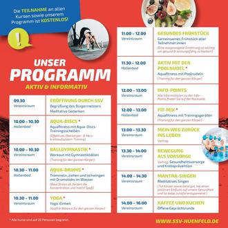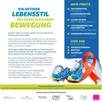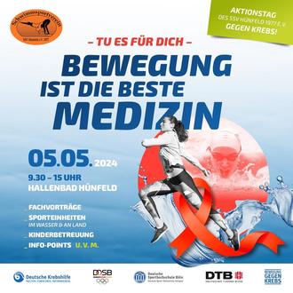Hünfeld. "Bewegung ist die beste Medizin" Das hat sich der Schwimmsportverein Hünfeld zu Herzen genommen und unterstützt deshalb den bundesweiten Aktionstag " Bewegung gegen Krebs " am 05.05.2024 im und um das Hallenbad Hünfeld. Es erwarten die Besucher tolle sportliche Angebote im Vereinsraum und im Wasser. Fachvorträge mit Tipps und Hilfen für mehr Bewegung, Pflege der Haut, sowie eine ganzheitliche Gesundheitsberatung. Die Einnahmen aus dem Verkauf von Kaffee und Kuchen werden der deutschen Krebshilfe gespendet. Der Verein freut sich auf viele Besucher.