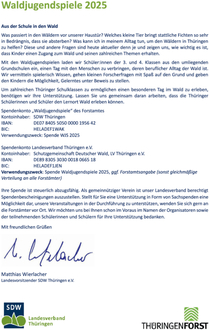 Verwendungszweck: Spende Waldjugendspiele 2025, ggf. Forstamtsangabe (sonst gleichmäßige Verteilung an alle Forstämter)