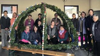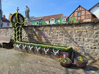 Motzlar. In der Motzlarer Dorfmitte wurde kürzlich bei herrlichem Frühlingswetter der Osterbrunnen aufgestellt. Mit viel Eifer wurde Buchs gesucht und Thuja geschnitten. Im Anschluss wurde von vielen ehrenamtlichen Helfern der Kranz gewickelt und mit den bunten, gehäkelten Eiern der Strickfrauen geschmückt. Bei Kaffee, leckerem Kuchen und Schnittchen haben alle Mithelfer einen schönen Nachmittag verbracht. Ein herzliches Dankeschön an alle Unterstützer des Osterbrunnenprojektes.