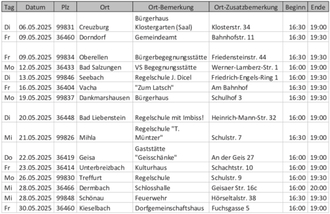 | Fr | 16.05.2025 | 36404 | Vacha | "Zum Latsch" | Am Bahnhof | 16:30 | 19:30 |
