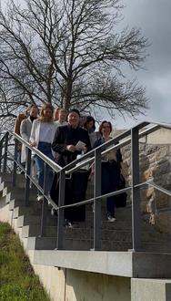 Teilnehmergruppenfoto auf der Venentreppe (v.l.n.r. hinten) Peter Wolff alias Pfarrer Sebastian Kneipp, Reimund Becker (Schatzmeister Kneipp-Bund Landesverband Hessen), Anja Kiel (Rhön GmbH) (v.l.n.r. mitte) Andrea Schade (Biosphärenreservat Rhön), Claudia Kircher Storch (Physiotherapeutin und Kräuterexpertin) (v.l.n.r. vorne) Bürgermeisterin Manuela Henkel, Andrea Henkel (Bauamt Stadt Geisa), Nadine Heusing (Regionalentwicklung – Landratsamt Wartburgkreis)