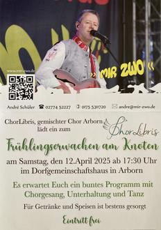 Der gemischte Chor „ChorLibris“ aus Arborn lädt ein zum „Frühlingserwachen am Knoten“. Es erwartet Sie ein buntes Programm mit Chorgesang, Unterhaltung und Tanz. Für Getränke und Speisen ist bestens gesorgt.