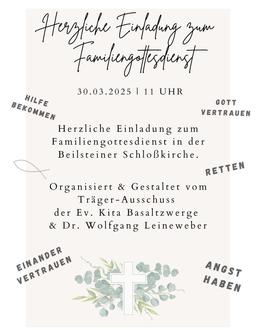 | 11.00 Uhr | Familiengottesdienst mit der Beilsteiner Kita, dem Kita-Trägerausschuss und Pfarrer Dr. Wolfgang Leineweber in der ev. Schlosskirche in Beilstein |