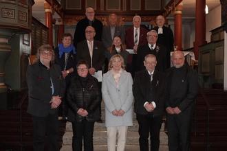 Die vordere Reihe zeigt die am 24.03. dabei gewesenen Goldenen Konfirmandinnen und Konfirmanden mit (von links) Wolfgang Grün, Martina Wagner, geb. Stahl, Eva Martina Jung, geb. Kündgen, Thomas Leichthammer und Axel Schmidt.