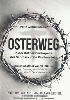 | 22.30 Uhr | Osternachtsfeier, beginnend am Feuer im Garten des ev. Gemeindehaus Greifenstein. Der Osterweg führt durch die Kasematten in die Katharinenkapelle und von dort in die noch dunkle Schlosskirche, wo die Feier in die Taufe eines Konfirmanden mündet. Herzliche Einladung! |