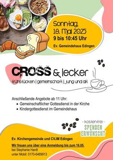 | 9 Uhr | Cross & Lecker Gemeindefrühstück im ev. Gemeindehaus Edingen, anschließend um 11 Uhr Gottesdienst in der ev. Kirche mit Pfr. Dr. Armin Kistenbrügge |