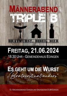 | 18.30 Uhr | Triple B Männerabend im ev. Gemeindehaus Edingen: Bibel, Bier... und Bratwurst |