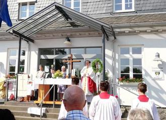 Am vergangenen Donnerstag feierte der kath. Kirchort Driedorf nach altbewährter Tradition das Fronleichnamsfest mit einem feierlichen Gottesdienst unter Leitung von Pfarrer Christian Fahl vor dem Rathaus unter blauem, sonnigem Himmel und zusammen mit vielen Mitchristen, sowie der Pfarrerin Frau Fialla-Michel von der evangelischen Gemeinde. Der neu gegründete Gesamtchor, zusammengeführt aus den Kirchenchören Driedorf, Westernohe und Rennerod unter Leitung von Achim Reif, gestaltete den Gottesdienst musikalisch mit. Die anschließende Prozession führte erstmals um die evangelische Kirche und wieder auf den Marktplatz, wo zum Abschluss der sakramentale Segen gespendet wurde.
