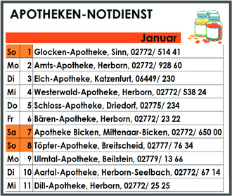 | Mi | 26 | Dill-Apotheke, Herborn, 02772/2525 |