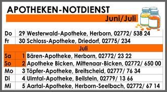 Unsere Gemeinde gehört zum Apotheken-Notdienstkreis 21. Den Notdienst der entsprechenden Apotheken haben wir hierwöchentlich für Sie aufgelistet. Apotheken aus anderen - an unsere Gemeinde angrenzenden - Notdienstkreisen, die möglicherweise aber näher an Ihrem Ortsteil liegen, können Sie sich auf www.apotheken.de anzeigen lassen.