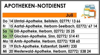 Unsere Gemeinde gehört zum Apotheken-Notdienstkreis 21. Den Notdienst der entsprechenden Apotheken haben wir hier wöchentlich für Sie aufgelistet. Apotheken aus anderen - an unsere Gemeinde angrenzenden - Notdienstkreisen, die möglicherweise aber näher an Ihrem Ortsteil liegen, können Sie sich auf www.apotheke.de anzeigen lassen. Sie haben außerdem die Möglichkeit, sich beim Apothekenfinder unter der Telefonnummer 0800 / 00 22 833 die notdiensthabenden Apotheken in der Nähe ansagen zu lassen.