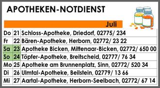 Unsere Gemeinde gehört zum Apotheken-Notdienstkreis 21. Den Notdienst der entsprechenden Apotheken haben wir hier wöchentlich für Sie aufgelistet. Apotheken aus anderen - an unsere Gemeinde angrenzenden - Notdienstkreisen, die möglicherweise aber näher an Ihrem Ortsteil liegen, können Sie sich auf www.apotheke.de anzeigen lassen. Sie haben außerdem die Möglichkeit, sich beim Apothekenfinder unter der Telefonnummer 0800 / 00 22 833 die notdiensthabenden Apotheken in der Nähe ansagen zu lassen.