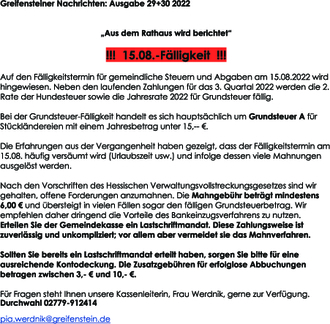 Auf den Fälligkeitstermin für gemeindliche Steuern und Abgaben am 15.08.2022 wird hingewiesen. Neben den laufenden Zahlungen für das 3. Quartal 2022 werden die 2. Rate der Hundesteuer sowie die Jahresrate 2022 für Grundsteuer fällig.