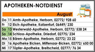 Unsere Gemeinde gehört zum Apotheken-Notdienstkreis 21. Den Notdienst der entsprechenden Apotheken haben wir hier wöchentlich für Sie aufgelistet. Apotheken aus anderen - an unsere Gemeinde angrenzenden - Notdienstkreisen, die möglicherweise aber näher an Ihrem Ortsteil liegen, können Sie sich auf www.apotheke.de anzeigen lassen. Sie haben außerdem die Möglichkeit, sich beim Apothekenfinder unter der Telefonnummer 0800 / 00 22 833 die notdiensthabenden Apotheken in der Nähe ansagen zu lassen.