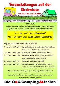 | Außerdem sind auch alle interessierten Kinder, Jugendlichen und Erwachsenen aus unserer Gemeinde ganz herzlich zu den Angeboten des OAC-Campingmissionsteams auf der „Kirchwiese“ an der Ulmbachtalsperre (in der Mitte des dortigen Campingplatzes) eingeladen: | |