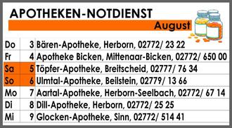 Unsere Gemeinde gehört zum Apotheken-Notdienstkreis 21. Den Notdienst der entsprechenden Apotheken haben wir hierwöchentlich für Sie aufgelistet. Apotheken aus anderen - an unsere Gemeinde angrenzenden - Notdienstkreisen, die möglicherweise aber näher an Ihrem Ortsteil liegen, können Sie sich auf www.apotheken.de anzeigen lassen.