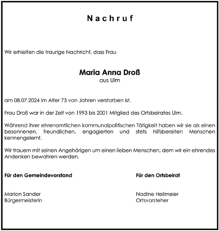 Frau Droß war in der Zeit von 1993 bis 2001 Mitglied des Ortsbeirates Ulm.