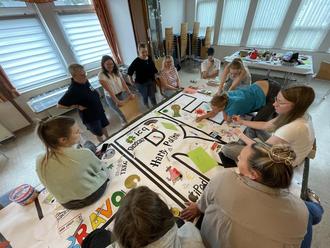 Das Orga-Team hatte dazu Alt und Jung an den letzten beiden Wochenenden in das örtliche Dorfgemeinschaftshaus eingeladen, um gemeinsam ein Banner zu gestalten, das zum Ortsjubiläum im Festzelt ausgestellt und somit zu einem zentralen Bestandteil der Feierlichkeiten werden soll.