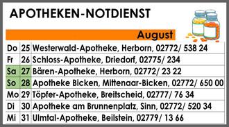 Unsere Gemeinde gehört zum Apotheken-Notdienstkreis 21. Den Notdienst der entsprechenden Apotheken haben wir hier wöchentlich für Sie aufgelistet. Apotheken aus anderen - an unsere Gemeinde angrenzenden - Notdienstkreisen, die möglicherweise aber näher an Ihrem Ortsteil liegen, können Sie sich auf www.apotheke.de anzeigen lassen. Sie haben außerdem die Möglichkeit, sich beim Apothekenfinder unter der Telefonnummer 0800 / 00 22 833 die notdiensthabenden Apotheken in der Nähe ansagen zu lassen.
