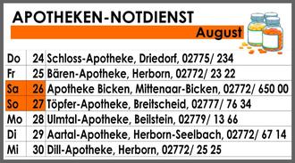 Unsere Gemeinde gehört zum Apotheken-Notdienstkreis 21. Den Notdienst der entsprechenden Apotheken haben wir hierwöchentlich für Sie aufgelistet. Apotheken aus anderen - an unsere Gemeinde angrenzenden - Notdienstkreisen, die möglicherweise aber näher an Ihrem Ortsteil liegen, können Sie sich auf www.apotheken.de anzeigen lassen.