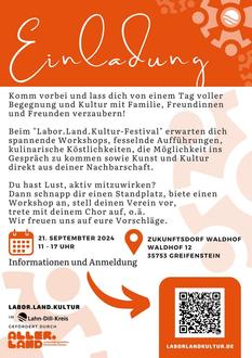 Am 21. September 2024 findet von 11:00 bis 17:00 Uhr das LaborLandKultur Festival im Zukunftsdorf Waldhof (Waldhof 12, 35753 Greifenstein) zum Thema "Generationenbegegnungen in Kunst und Kultur" statt.