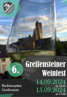 wieder zu seinem Weinfest rund um das Backhaus ein. In den letzten Jahren hat sich das Weinfest des TuSpo allseits großer Beliebtheit erfreut und auch in diesem Jahr kommen unsere Gäste wieder in den Genuß ausgesuchter Weine und verschiedener kleiner Speisen. So gibt eine große Auswahl verschiedener Weiß-, Rosé- und Rotweine. Auch für den kleinen Hunger zwischendurch ist gesorgt mit Käse, Weißbrot und Bratwurst. Der TuSpo Greifenstein freut sich Euch begrüßen zu dürfen und wünscht allen Gästen eine schöne und entspannte Zeit.