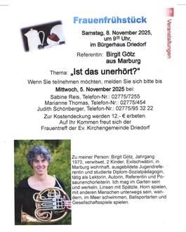 am 05. Oktober um 10:00 Uhr in der Evangelischen Kirche zu Driedorf. Anschließend wird im Betsaal ein gemeinsames Essen angeboten.