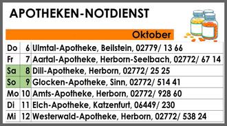 Unsere Gemeinde gehört zum Apotheken-Notdienstkreis 21. Den Notdienst der entsprechenden Apotheken haben wir hier wöchentlich für Sie aufgelistet. Apotheken aus anderen - an unsere Gemeinde angrenzenden - Notdienstkreisen, die möglicherweise aber näher an Ihrem Ortsteil liegen, können Sie sich auf www.apotheke.de anzeigen lassen. Sie haben außerdem die Möglichkeit, sich beim Apothekenfinder unter der Telefonnummer 0800 / 00 22 833 die notdiensthabenden Apotheken in der Nähe ansagen zu lassen.