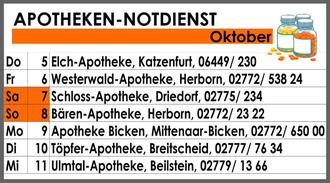 Unsere Gemeinde gehört zum Apotheken-Notdienstkreis 21. Den Notdienst der entsprechenden Apotheken haben wir hierwöchentlich für Sie aufgelistet. Apotheken aus anderen - an unsere Gemeinde angrenzenden - Notdienstkreisen, die möglicherweise aber näher an Ihrem Ortsteil liegen, können Sie sich auf www.apotheken.de anzeigen lassen.