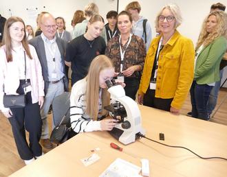 Leica würdigte mit dieser großzügigen Spende die sehr gute Zusammenarbeit zwischen der Schule und dem Unternehmen. Denn gerade nach dem schulischen Ausbildungsweg schlugen einige JGS`ler den beruflichen Weg zum Global Player aus Wetzlar ein. So war es auch keine Überraschung, dass Schulleiterin Annegret Schilling, Biologiefachbereichsleiterin Simone Strauß-Schwabe und MINT-Koordinator Marc Schäm eine ehemalige Schülerin im Werk begrüßen konnten. Nach einer kurzen Präsentation von Leica Microsystems, den weltweiten Werkstandorten und den betrieblichen Ausbildungsmöglichkeiten wurde den dann das Mikroskop vorgestellt. Tubus, Objektrevolver und Tisch wurden genauestens erklärt, bevor die beiden Zehntklässlerinnen Lucia Tinz und Joline Kretschmer, die zu der Besuchergruppe aus Ehringshausen gehörten, einen Blick durch das Okular werfen konnten. Dabei konnten sie sehen, wie deutlich und tiefenscharf Exponate auf den Objektträgern zu erkennen sind. „So macht das Mikroskopieren wirklich riesigen Spaß“, waren sich beide abschließend einig. Denn mit physikalischen Prinzipien ist es möglich, durch einen Vergrößerungseffekt Objekte oder deren Struktur sichtbar zu machen, die mit „normalem“ Auge kaum oder auch gar nicht zu sehen sind. Das Auflösungsvermögen des menschlichen Auges braucht hierbei eine deutliche Unterstützung. „Und wo viel Technik im Spiel ist, muss man finanziell auch deutlich tiefer in die Tasche greifen. Nicht nur deshalb freuen wir uns, dass unsere Schule so hochwertige Mikroskope von Leica bekommt“, freut sich Schulleiterin Annegret Schilling und Biologiefachleiterin Simone Strauß-Schwabe ergänzt: „Damit können wir das naturwissenschaftliche Arbeiten noch mehr fördern, denn das Experimentieren ist die zentrale Methode naturwissenschaftlicher Erkenntnisgewinnung.“