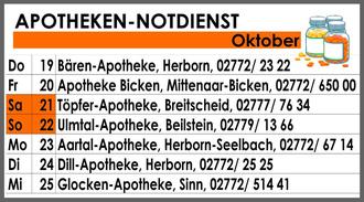Unsere Gemeinde gehört zum Apotheken-Notdienstkreis 21. Den Notdienst der entsprechenden Apotheken haben wir hierwöchentlich für Sie aufgelistet. Apotheken aus anderen - an unsere Gemeinde angrenzenden - Notdienstkreisen, die möglicherweise aber näher an Ihrem Ortsteil liegen, können Sie sich auf www.apotheken.de anzeigen lassen.